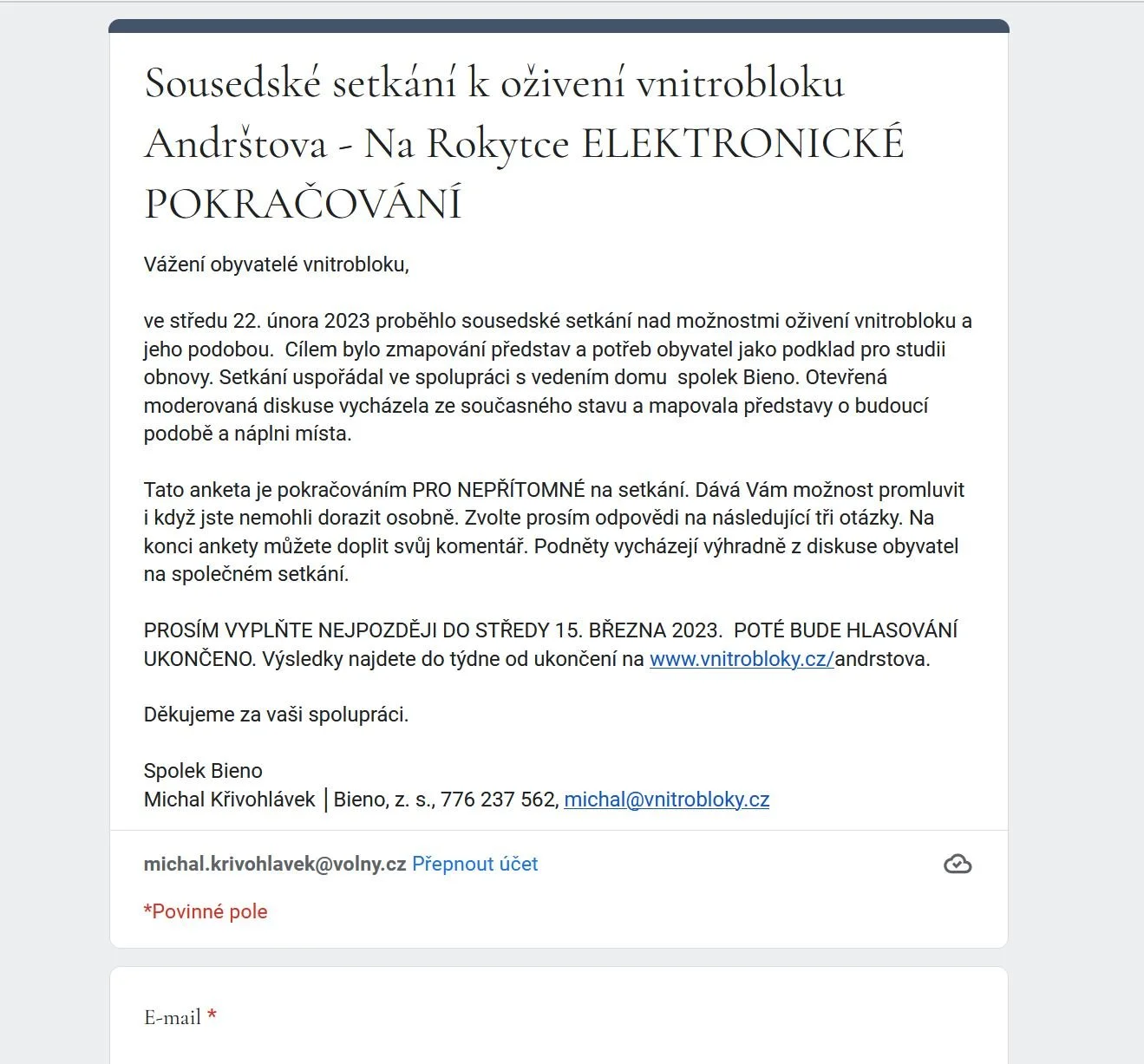 Obyvatelé tří navazujících bytových domů v ulici Andrštově a Na Rokytce dospěli k rozhodnutí zvelebit svůj vnitroblok a postupovat v tom společně. Pozemky přiléhají z jedné strany k fasádám a z druhé se otevírají do prostorného velkorysého vnitrobloku parkového typu, se sportovním a dětským hřištěm, který je celý zčásti v majetku města a zčásti v rukou soukromého majitele.