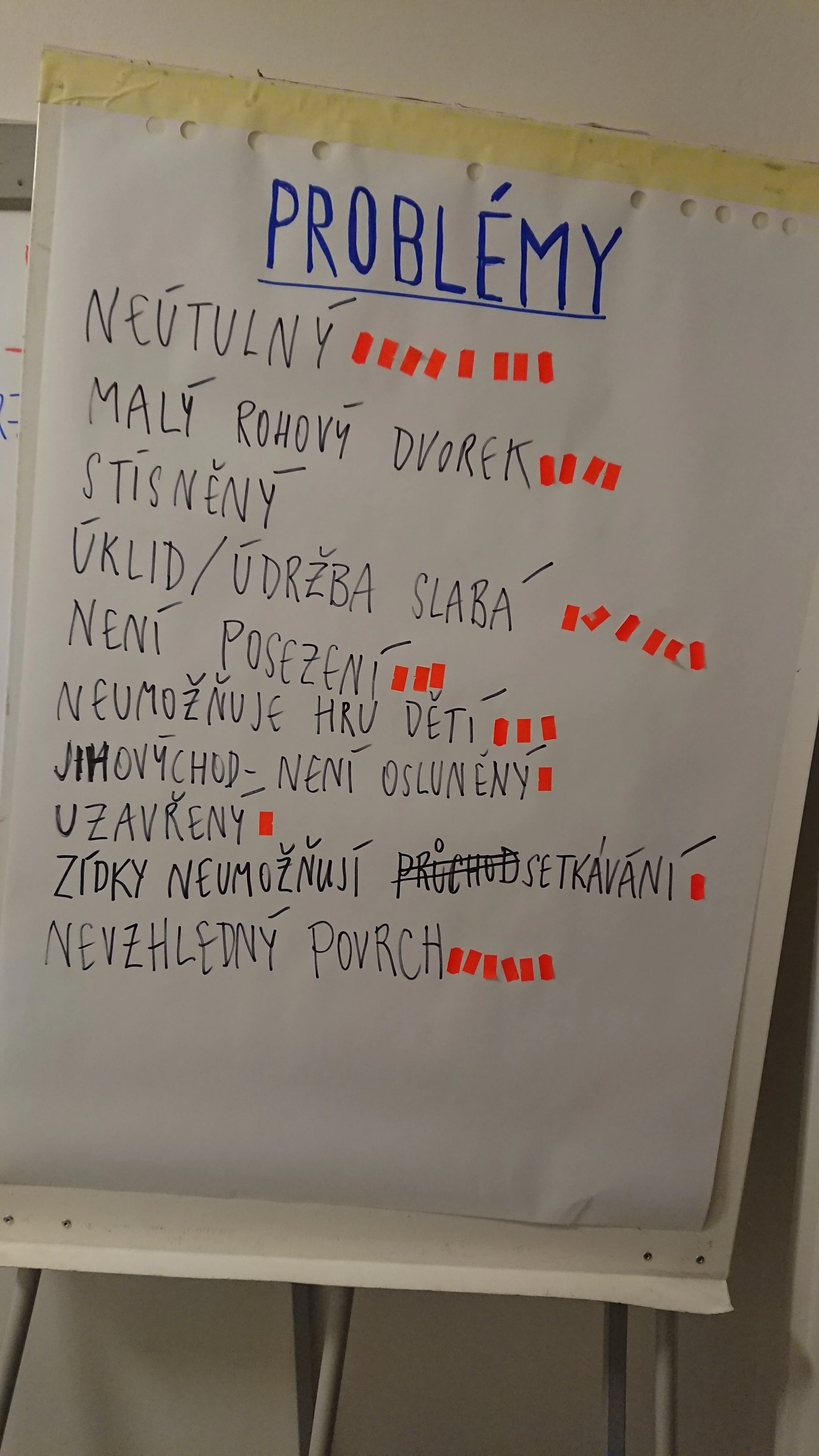 První společné setkání uživatelů nad podobou dvora. Programem setkání je zjištění problémů, hodnot a vítaných aktivit očima uživatelů dvora a jejich prioritizace.