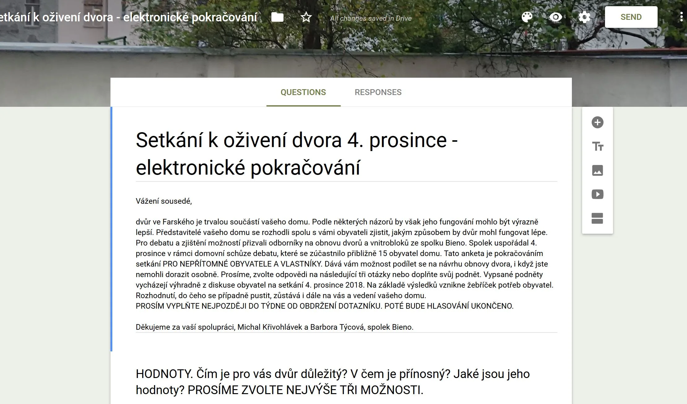 Dvůr ve Farského 7 v pražských Bubnech je rohový dlážděný dvůr, který v současnosti slouží zejména jako stanoviště pro popelnice. Podle názorů některých obyvatel by však jeho fungování mohlo být výrazně lepší. Dvůr sousedí s obdobnými dvory v podobném stavu. Představitelé domu se rozhodli spolu s obyvateli zjistit, jakým způsobem by dvůr mohl fungovat lépe. Pro debatu a zjištění možností přizvali odborníky na obnovu dvorů a vnitrobloků ze spolku Bieno. Spolek uspořádal 4. prosince v rámci domovní schůze SVJ debatu, které se zúčastnilo přibližně 15 obyvatel domu. K debatě byli pozvání všichni obyvatelé domu tištěnou pozvánkou, která byla roznesena do poštovních schránek a vyvěšena na nástěnkách domu.
