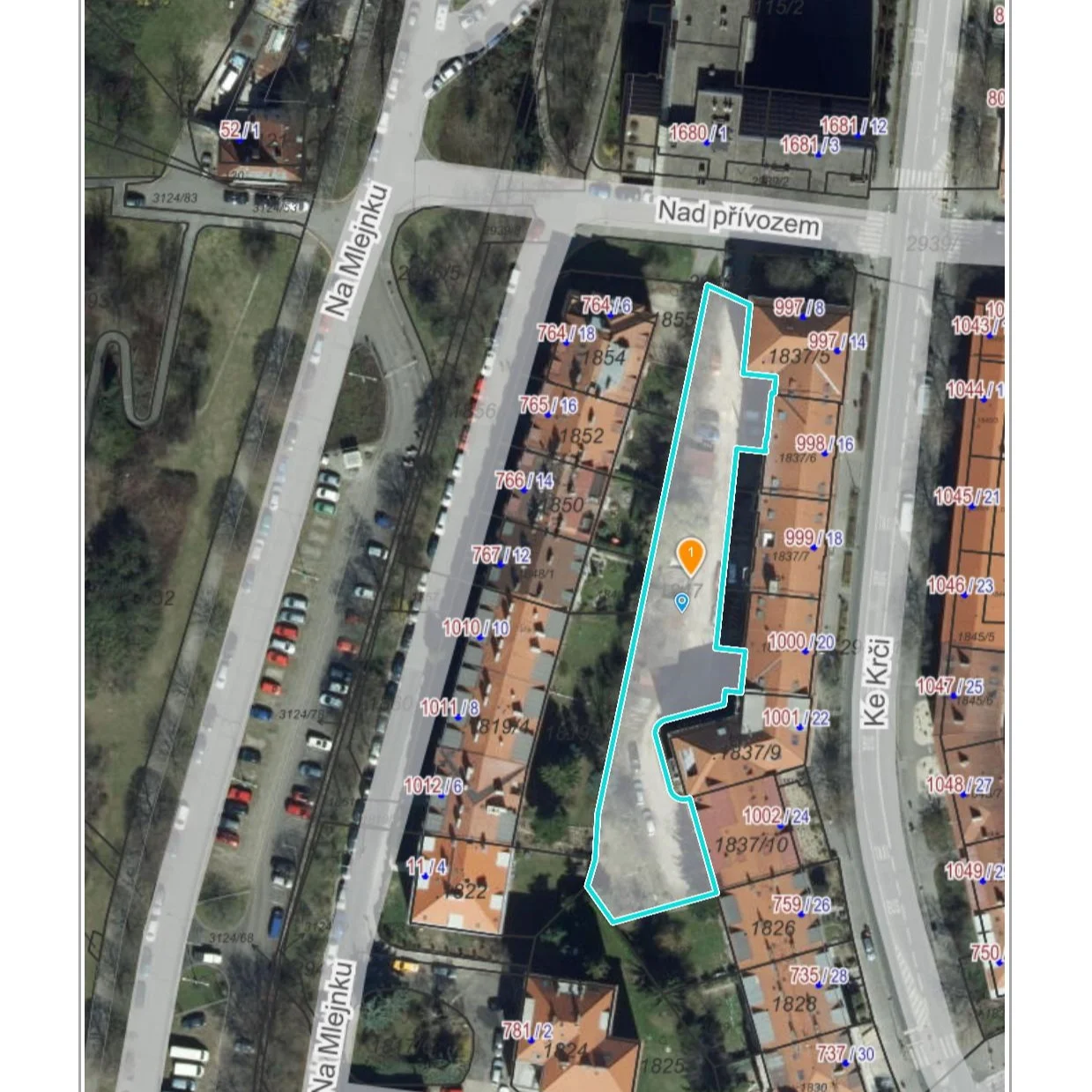 Podlouhlý vnitroblok se nachází mezi obytnou zástavbou v ulici Na Mlejnku a Ke Krči. Volný přístup je umožněn od severu z ulice Nad přívozem. Řešené území o výměře cca 1500 m2 tvoří západní část pozemku (p.č.1847) ve správě MČ Praha 4, která přiléhá k řadě šesti obytných budov v ulici Ke Krči (parcelní číslo 1837/5 - 1837/10). Východní hranici tvoří plot, který dvůr odděluje od menších dvorků přiléhajících k řadě budov v ulici Na Mlejnku.