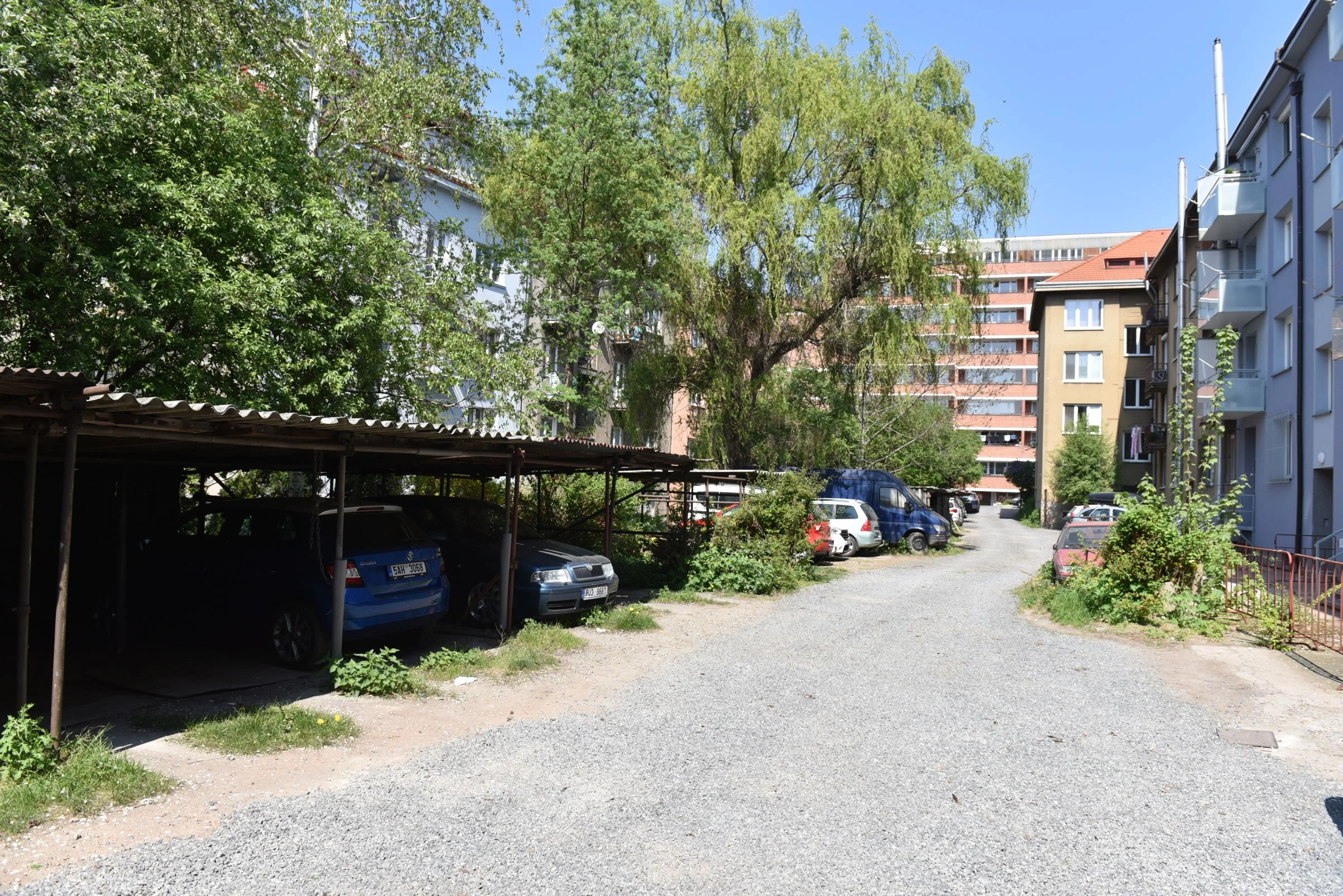 Celý západní okraj komunikace od severu k jihu lemují parkovací stání na rostlém terénu, původně zřejmě živelná, dnes pronajímaná, z toho 14 parkovacích míst je krytých přístřešky z trubek a plechů. Za parkovacím pruhem pokračuje rostlý terén, který se svažuje k oplocení. Tento úzký proužek je zarostlý dřevinami různých taxonů, z velké části náletovými, a břečťanem. Převládají bezinky u vstupu, jižněji pak řada smrků. Ze vzrostlých stromů je zastoupen jasan, mohutná vrba, jeřáb, bříza a jabloně.