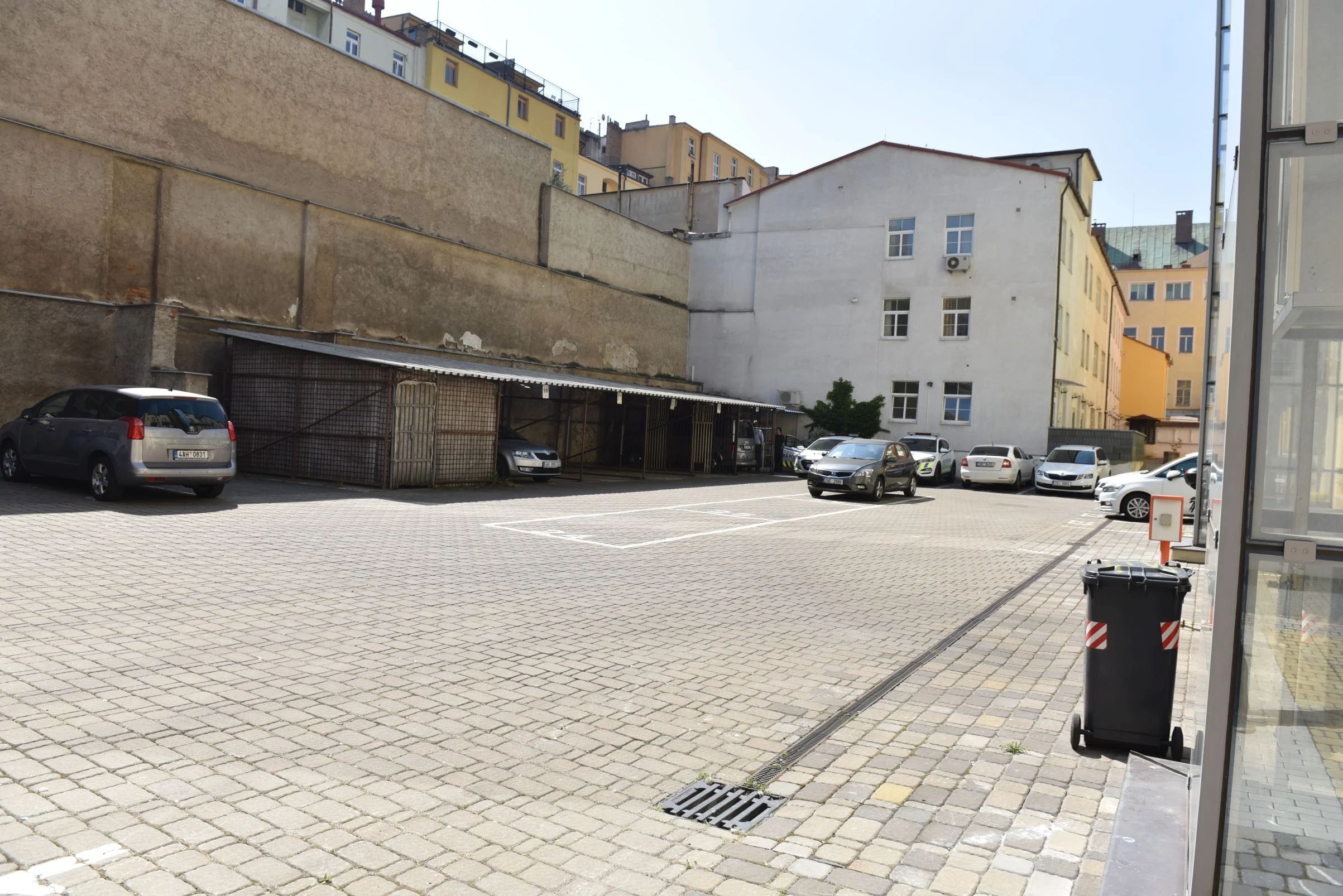 Zbývající část prostoru tvoří předpolí budovy městské policie. Terén je asi o 0,5 m vyvýšený nad terénem parkoviště, obě části spojuje dlážděná rampa, ke které před budovou policie přiléhá zídka z betonových tvárnic. Několik tvárnic na okraji zídky se opět využívá jako truhlíky. V předprostoru policejní služebny je náhodně umístěno 7 keramických květináčů (krychle o hraně asi 50 cm) s menšími keři, v sezóně zřejmě i květinami, které doplňují dvě lavičky (betonová konstrukce s dřevěným sedákem) a dva plechové odpadkové koše. Výrazným prvkem je kruhová cihlová zídka s dřevěným krytím, pravděpodobně studna. U bytového domu stojí 4 kontejnery na odpadky. Další tři popelnice jsou umístěny u závory v průjezdu.
