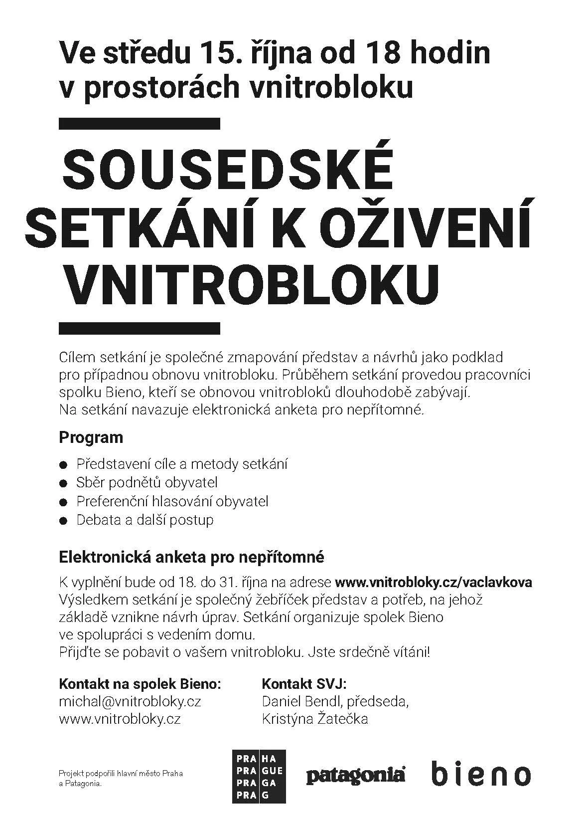 Ve středu 15. října proběhlo sousedské setkání nad možnostmi oživení vnitrobloku a jeho podobou. Cílem bylo zmapování představ a potřeb obyvatel jako podklad pro studii obnovy. Setkání uspořádal spolek Bieno ve spolupráci s vedením vašeho domu. Otevřená moderovaná diskuse vycházela ze současného stavu a mapovala představy o budoucí podobě a náplni místa. Na setkání navázala elektronická anketa pro nepřítomné.