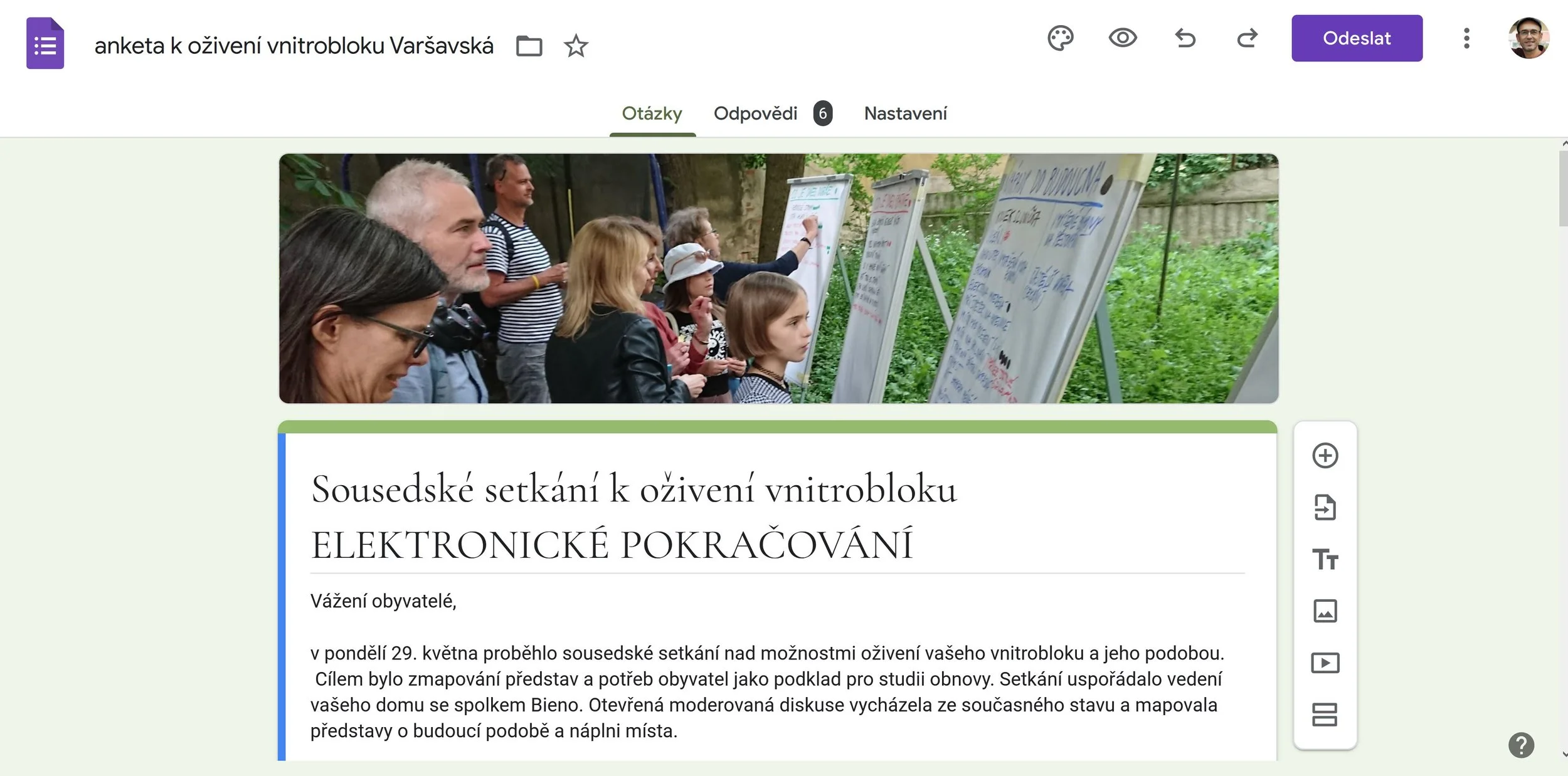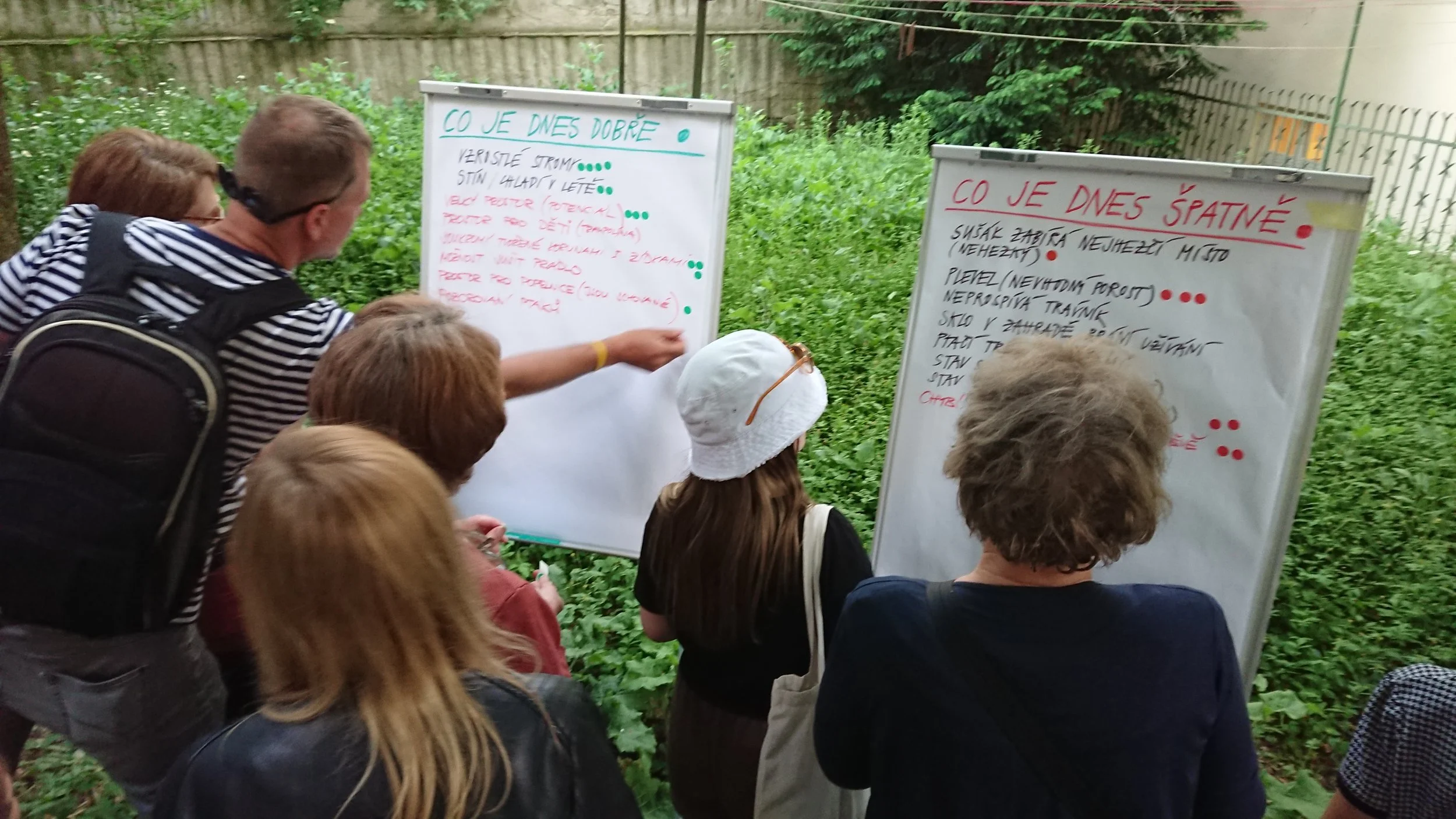 V pondělí 29. května proběhlo sousedské setkání nad možnostmi oživení vašeho vnitrobloku a jeho podobou. Setkání předcházela prohlídka stromů arboristou, který posoudil jejich stav a perspektivu dalšího života. Všechny vzrostlé stromy, které tvoří výrazný charakter místa, mají po zásazích šanci na další zdravý život. Setkání se zúčastnilo přibližně deset obyvatel. Na setkání navazuje elektronická anekta pro nepřítomné.